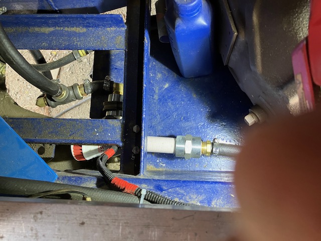 This is the coolant heat exchanger I chose for the intercooler. It features 8 AN fittings which are about the largest flow for this class of cooler. It's also compact enough that I could work it into the engine house door cooling-center. | The ABS fitting I chose for the reservoir made it easy to adapt down to a 1" braided hose off the top (4") to get me a simple filler hose over to the rad fill access. The screw in plug also helps with bleeding air out of the system. | Overhead view of the live-bait-well pump. I also tee-ed off the outlet hose with a drain-cock fitting to easily drain the (approx 2-qts) from the system if needed. | I cut up some 1/8" plate to mount the left side of the cooler on while the right side simply bolted into the main frame rail. It was solid then but I also elected to put a small (adjustable tension) pipe strap stay on the top as well. | ||