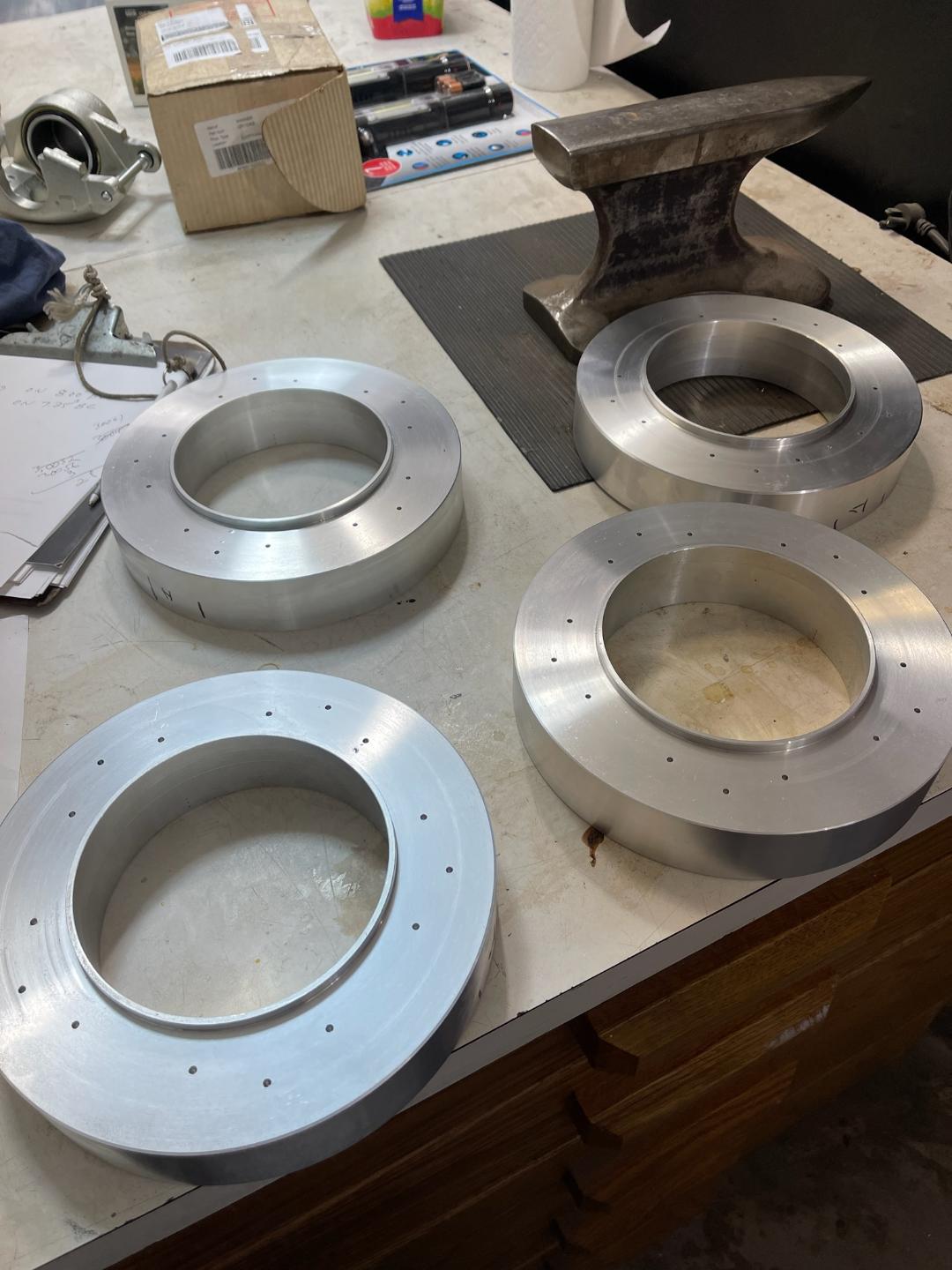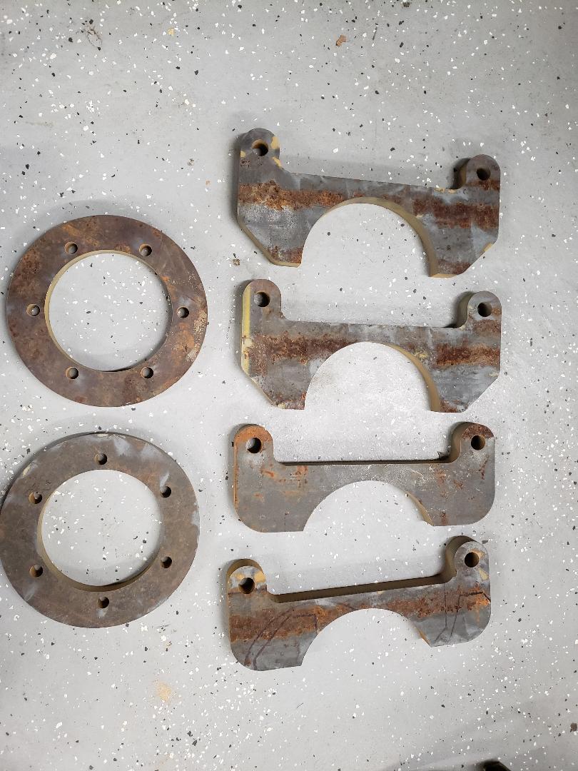 Decided on doing the Ford disc brake conversion. Couldn't have even tried without Matt Fitzsimmons help. My GMC buddy Wally roughed out these aluminum spacers for me-really cleaver, talanted, great guy. Can't thank them both enough. | Waterjet cut brackets. Lucky I had the steel on hand. | Using Bendix pads. | Huge 15" Ford rotor and matching caliper. Almost 2.5" larger diameter than the fMC Transits used but easy to find. | ||