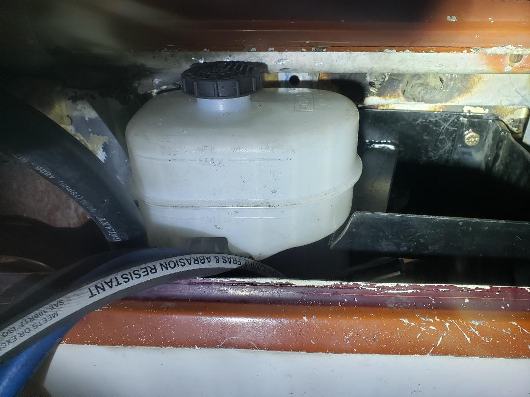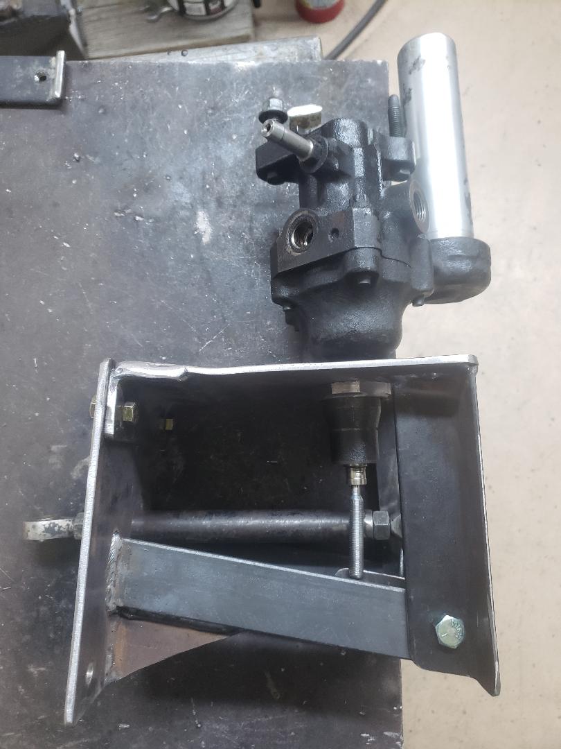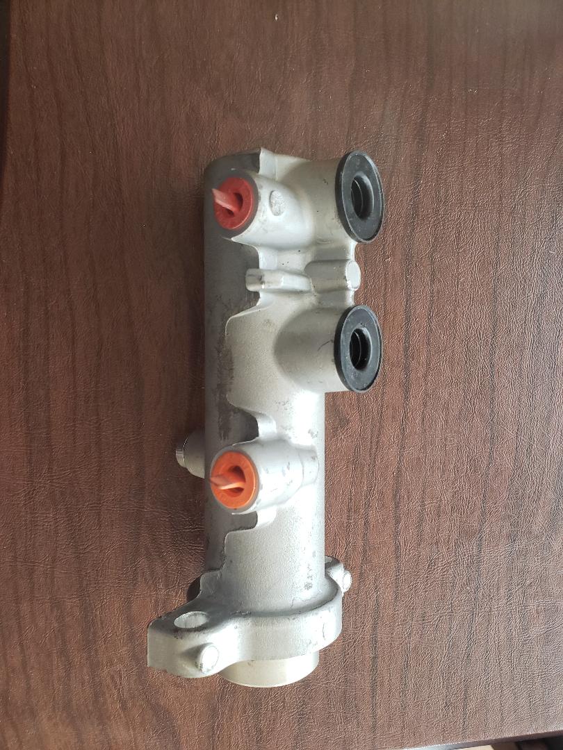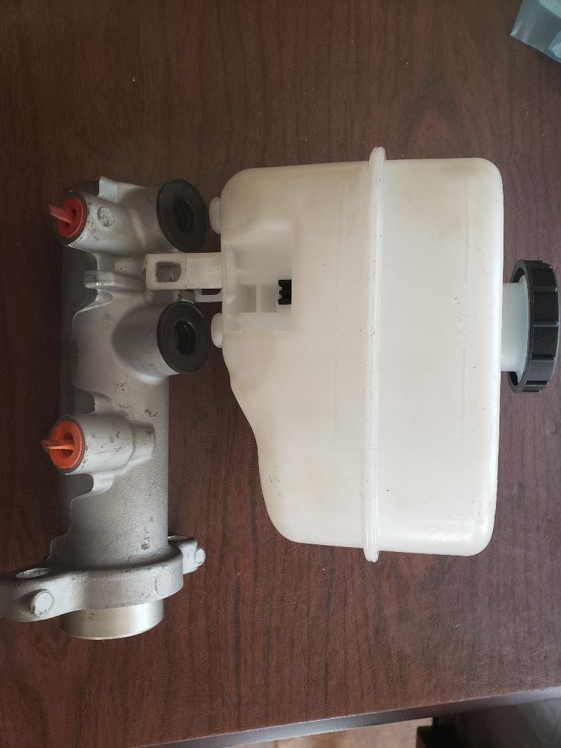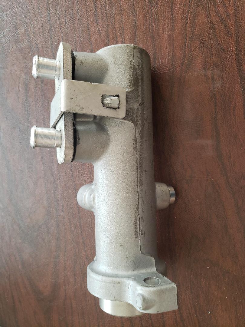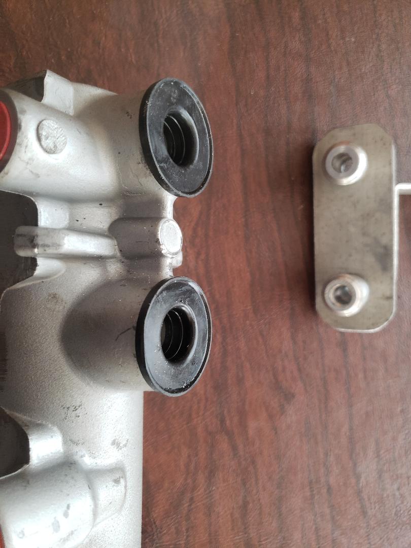 The rod to the left goes to the brake pedal. There is an additional diagonal brace not shown which will make things very stout. | This is the master cylinder I'll be using. It was used on 2016 F550 trucks, the same vehicle the calipers I'm using came from. | Space is at a premium and there isn't room for the reservoir so I'll need to remote mount it. | Here is a view of the adapter bungs and holder that will be used for the remote reservoir. | ||