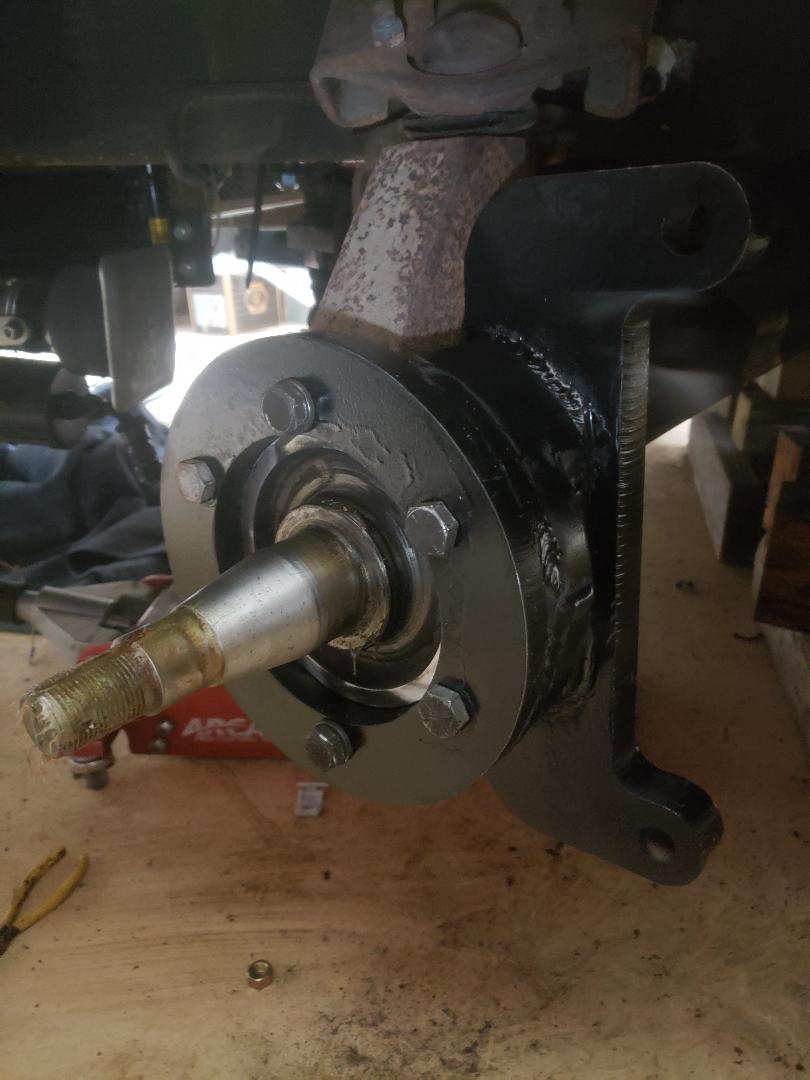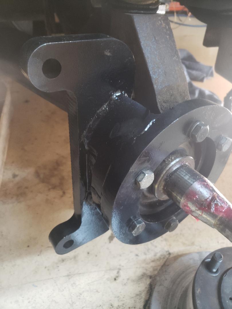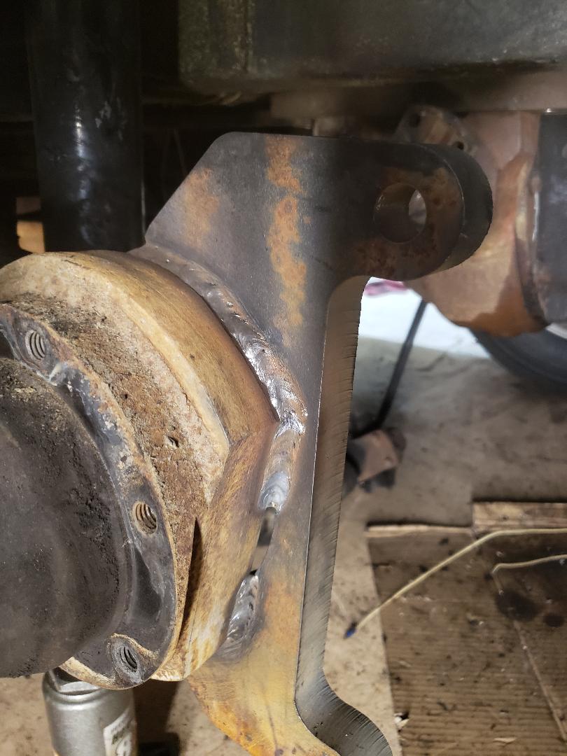 Drivers side rear caliper bracket | Still need to find some brake hose that will work. | The later control arms are relieved for disc brake callipers. Makes things abit easier. | Front bracket welded up and ready to squirt and mount. The round flange is 3/4", the two hole bracket is 1". Plenty stout | ||