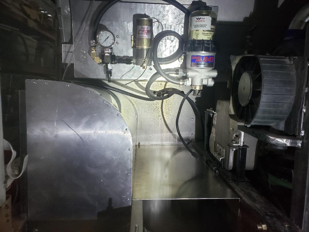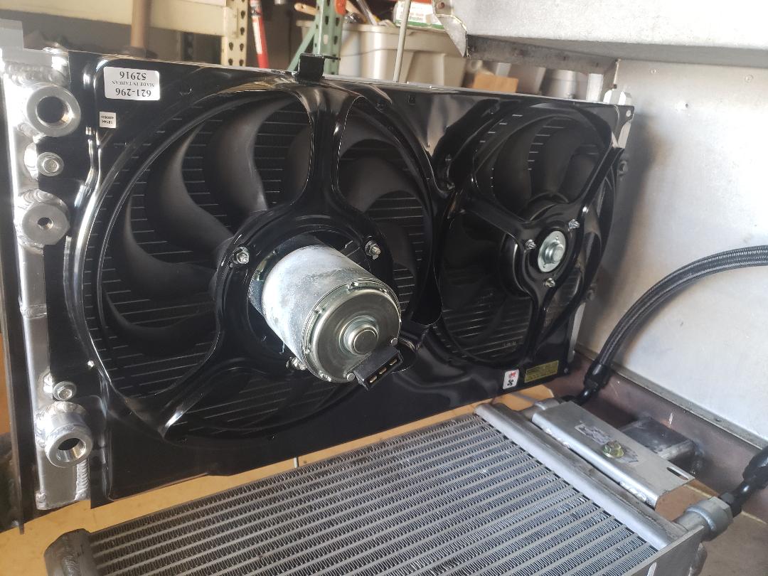 I ended up moving the aux trans cooler to this location. It will be the primary fluid cooling heat exchanger then go through a pair of water to oil coolers. | Hear's a look at the fan shroud. The shroud is unusual as the shroud surrounds a second shroud that is attached to the engine which has a flexible gasket between the two. It permits the engine to move inside the main large shroud but maintains perfect blade tip to shroud distance. GM used this approach on their Duramax engines. This one was used on the 25" fans on later(2011-2016) engines | I made the shroud two piece for ease of service later if needed ("if needed", RIGHT!) | Here's a look at the CAC radiator fan shroud and partial heat shield to the right. The fuel pump, pressure regulator and primary fuel filter are mounted on the firewall. | ||