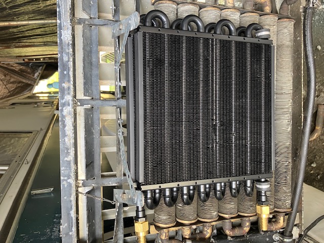 The ABS fitting I chose for the reservoir made it easy to adapt down to a 1" braided hose off the top (4") to get me a simple filler hose over to the rad fill access. The screw in plug also helps with bleeding air out of the system. | This is the coolant heat exchanger I chose for the intercooler. It features 8 AN fittings which are about the largest flow for this class of cooler. It's also compact enough that I could work it into the engine house door cooling-center. | Behind the new intercooler rad you can see I kept the awesome trans cooler from the 440' install that a PO (trucker) had installed. I've also added another smaller trans-cooler on the main radiator to further keep the 47RH cool. | |||
