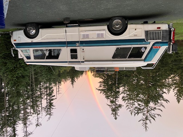 FINALLY! The old Ford Taurus fan steps back into service. It's pulling cool air through into the engine house at around 5000 CFM. I'm confident #846 will be a robust and cool-running 'Desert Rat' when I'm done with her. | After sitting for a year she's good-to-go to the lake for a few days. I think the 'Double-Rainbow' is a good sign that all will be well. | Roof rack turned out to be a godsend. Tons of room for extra firewood etc. She sits a tad higher in the rear if you noticed, and that's with only 20 psi in the airsprings. | First night... serenity. | ||
