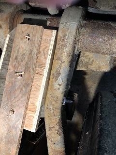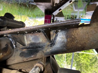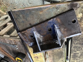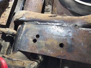 Prep work on the trailing arm/torsion bar tube mount bracket footprint. | Added two 5/16" small gussets to the angle bracket to beef it up some. Drilled 3 x 11/16" holes for the 3 x 5/8" (gr.#8)bolts that will secure the air-spring mount arm to the mount. Note: I made the bolt holes 1/16" larger for two reasons (1)I'm not a machinist and only have a simple drill press to drill these holes in correct alignment and knew I'd be off a bit so this would provide some wiggle room. (2)slightly larger holes would also provide useful horizontal adjustment to help correctly align the lower spring mount with the upper one on the chassis. The following pics show the mount in place and the welding tracks where it's attached to the trailing arm. | Ignore the extra hole in this view; it was already in the beam material I used. | Here you can see the weld on the radius of the outer torsion bar tube. Had to grind off a bunch of what appeared to be asphalt black undercoating to expose clean steel. | ||