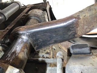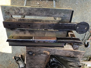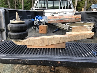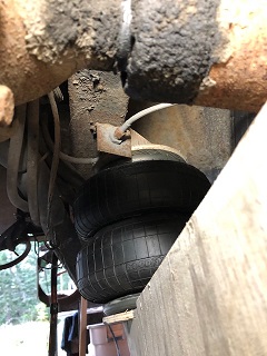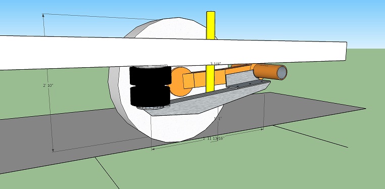 Included this pic to illustrate the close proximity of the bottom shock-mount to the edge of the air-spring mount beam. Got to thinking it might be a good idea to fab a simple bracket to provide an additional support-connection between the trailing arm and the air-bag arm while still providing the shock mount in the same position. Plan to look closer at this. | Air spring trailing arm mounts completed. As I cobbled these together from some gifted steel, they're rather patchworked together. They're about 36" long and the 6" round lower disc is tilted about 10 degrees upwards off the plane of the beam. If they prove not able to do the job, I'll simply make new ones out of heavier box channel steel. | (1 Comments) Disclaimer: This is a sketch of the general idea of the direction I've gone with on this air-spring mod on my coach. Any sketches and all related pictures I'm sharing here on this subject are simply to provide my fellow coach owners with another perspective on an air-spring install on an FMC motorcoach. I am not in any way endorsing/suggesting/advising that this method will work, or, is safe to copy or use on other coaches. Anyone who does so, does so at their own risk. | As Frank and Lenny and no doubt others have, I decided to mount the air-spring support on the trailing arm somehow. The road I took relies entirely on this 5/16" pc of angle iron being securely welded to the upper end of the trailing arm and to the outer torsion bar tube. This needed to be done right, so I hired a professional welder to do this particular job. All other parts I welded myself and as I am a woodworker by trade, I make no apologies for how sloppy many of the welds are. | ||