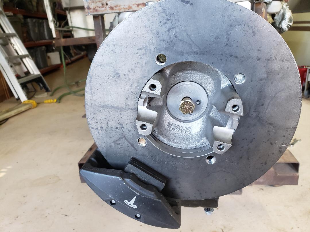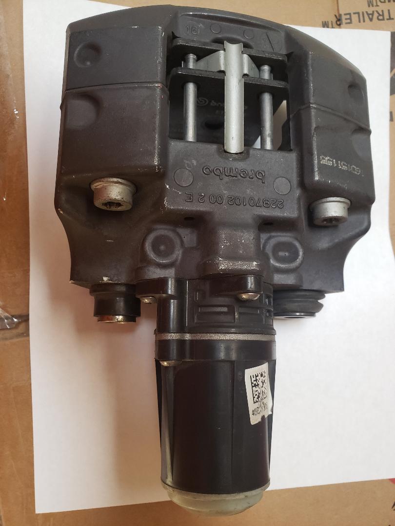 Here's the slip yoke and yoke shaft that make up the drive shaft. The slip is a Spicer 3-3-1511KX, the yoke shaft is 3-82-811. These use the 1410 series ujoint also. The Allison yoke is a 1480 so a conversion ujoint 3-1448 (1410/1480) will be used there. | Here is the Tesla parking caliper I'll be using. As I understand it these were used for parking but also could be deployed as an emergency brake during a brake failure. | These things can be bought on Ebay for not much money. The electric control isn't very difficult and there is a controller available for not too much $$. I may try one of my own though, we'll see. | This was a fun bracket to make. Its to hold the tesla caliper to the Allison tail housing. | ||