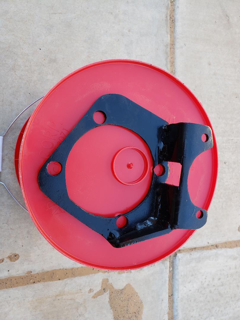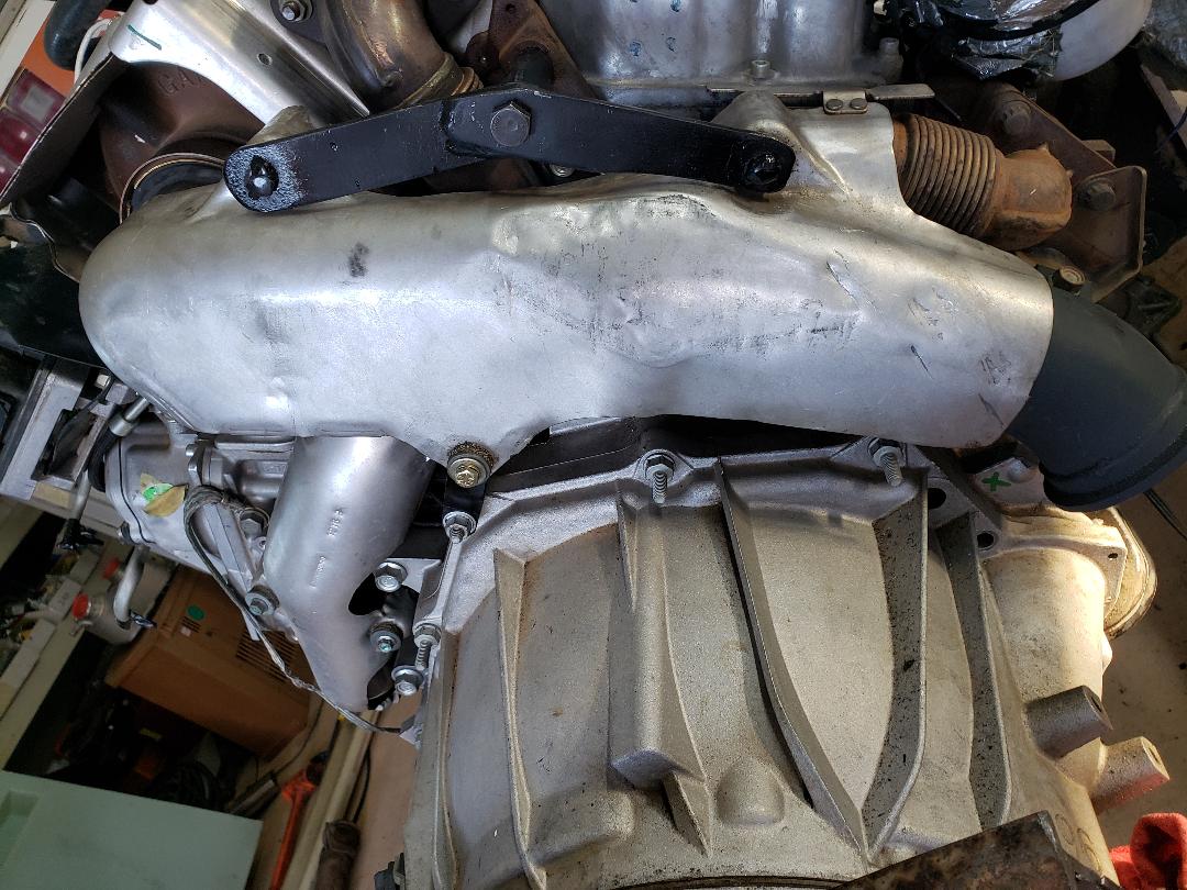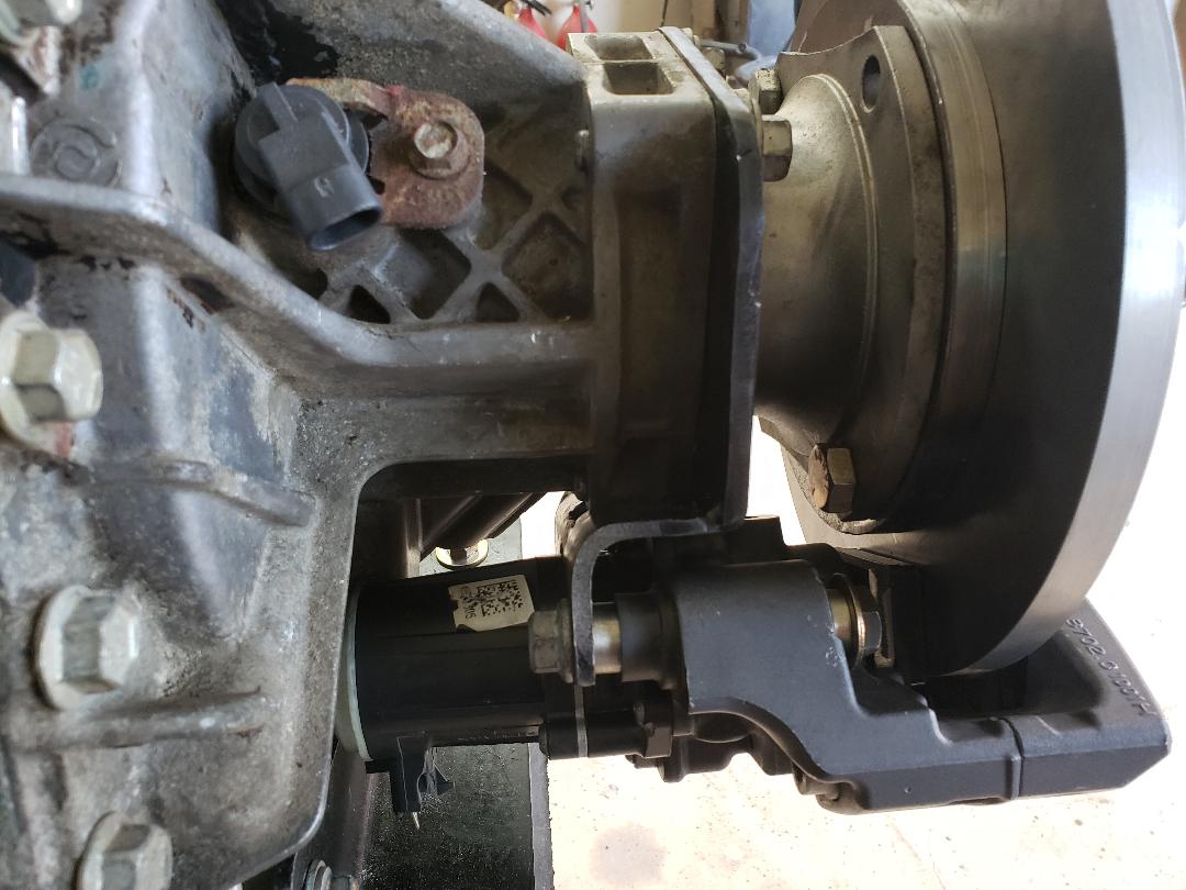 Different view of caliper. I had to reverse the motor on the caliper 180 degrees. It is a simple job, remove and replace two screws and try not to get any of the small gears released. Needed to reverse the electric receptacle for access. | (2 Comments) Here is how it looks from behind. Over 90% of pad is in contact with new rotor. Should offer plenty of grip.(I hope) | Here I added some extra support for the bracket, just in case.... | Added an after market down pipe. The OEM's had lots of crushed places that were needed to clear the fire wall. These flow much better and help with maintaining exhaust as well as engine temps. | ||