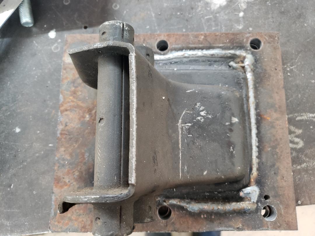 Decided to move the diff forward as per Stephem's suggestion. I limited the move to 1 3/4" to help maintain exhaust distance. Here is the template I made out of some scrap laying around. | I transfered the 7" bolt pattern of the differential mounting to the plate and added the hole 1.75"further along it. Using this I placed a bolt in the new hole (1.75" hole) and transfered the 7" pattern. | Here is a shot of the transfer punch. All that was left was drilling the 4 3/4" holes in the 1.5" thick by 2 1/2" differential support. Lots of chips. Sorry I didn't get any pictures of the actual support. | Got to start on some of the fun stuff. Here's the pass side motor mount to frame bracket. It'll be bolted in for ease of removal. | ||