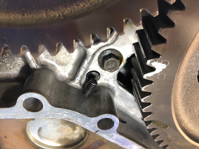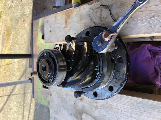 Took a bit of looking but I found a cheap pulley wheel for an electric motor etc. that fit perfect to gently drift/tap the new oil seal into place. Be careful not to let it get tilted out of whack. | New seals and yoke nuts done, now torque the yoke-nuts back and get this sucker back home where she belongs. Note on the pinion nut torque: After a lengthy discussion with Gord, at WestCoast Gear in Vancouver BC., I took his advise and nearly halved the previous torque spec (from 600 ft/lbs down to 350 ft/lbs) on the pinion yoke nut. He's rebuilt hundreds of gear cases for all kinds of heavy equipment and he was positive that 600 ft/lbs was far more than necessary. Again, this only his opinion and I happen to agree. What you chose to do is your business. | NOTE: I'd be remiss if I didn't add a reminder about the imperative confirm that the KDP (killer dowel pin) and the exhaust valve springs have been done on your 12 valve. The latter only required if you are going to run an exhaust brake. We did the exhaust valve springs (60-pounders) and confirmed the KDP pin had been addressed. | Here you can clearly see the KDP just behind the black bolt that was threaded into the aluminum casting to block the KDP from coming out of the hole then dropping down into the gears. This is a different way to remedy this as the usual kit involves using the hex bolt to the right to fasten a metal restraint clip over the pin. The way this was done, conceivably could be done without even removing the timing cover if you knew exactly where to drill and tap the hole. | ||