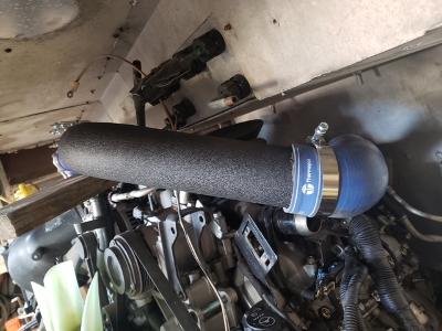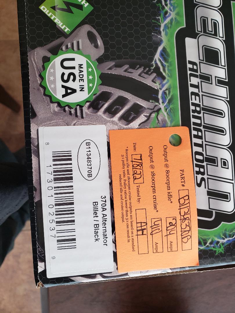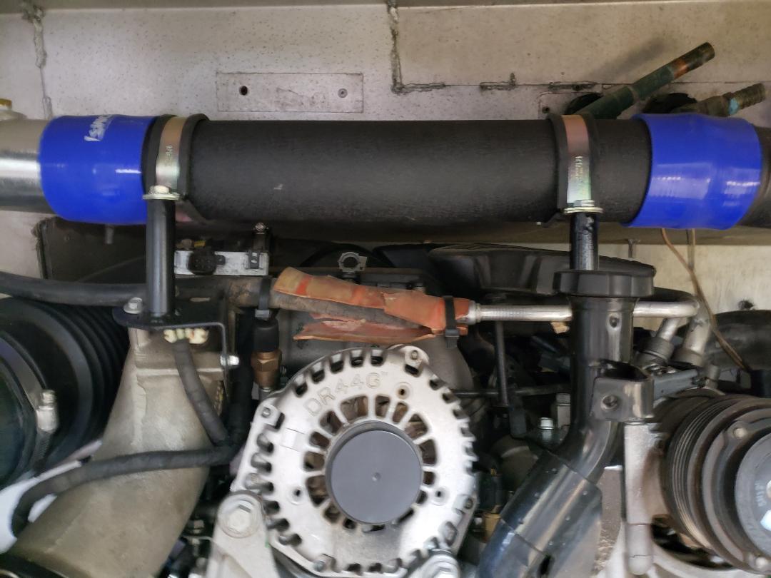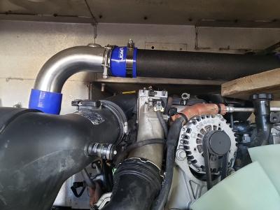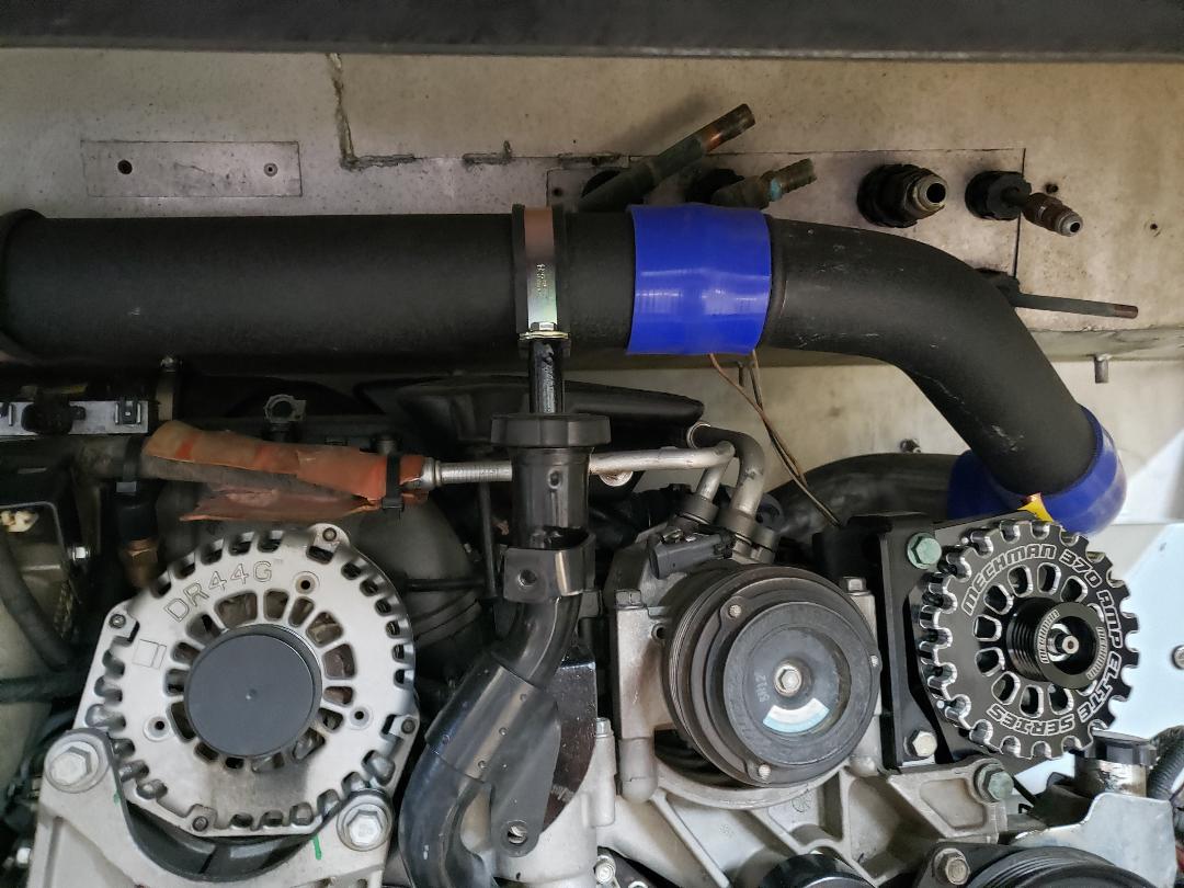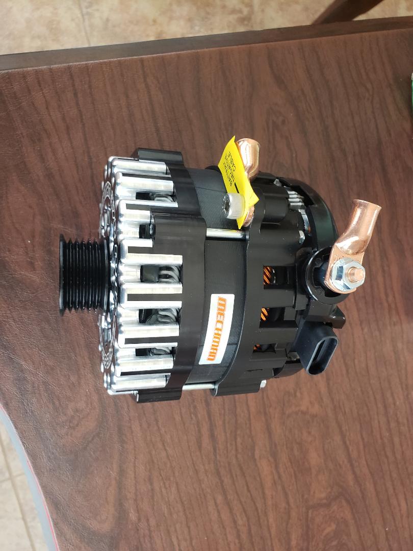 A bit more 'bling' than I prefer but it is what it is. | This will be my second alternator and be used only for the house. It can be configured for conventional or Lithium batteries. It's rated 370 amp although the as tested made 410. US made with a good warrantee. The 370 is the most a 6 grove belt will support. | Here are a couple of brackets to support the Turbo tubing. | Another angle with the new 370 amp alternator installed. | ||