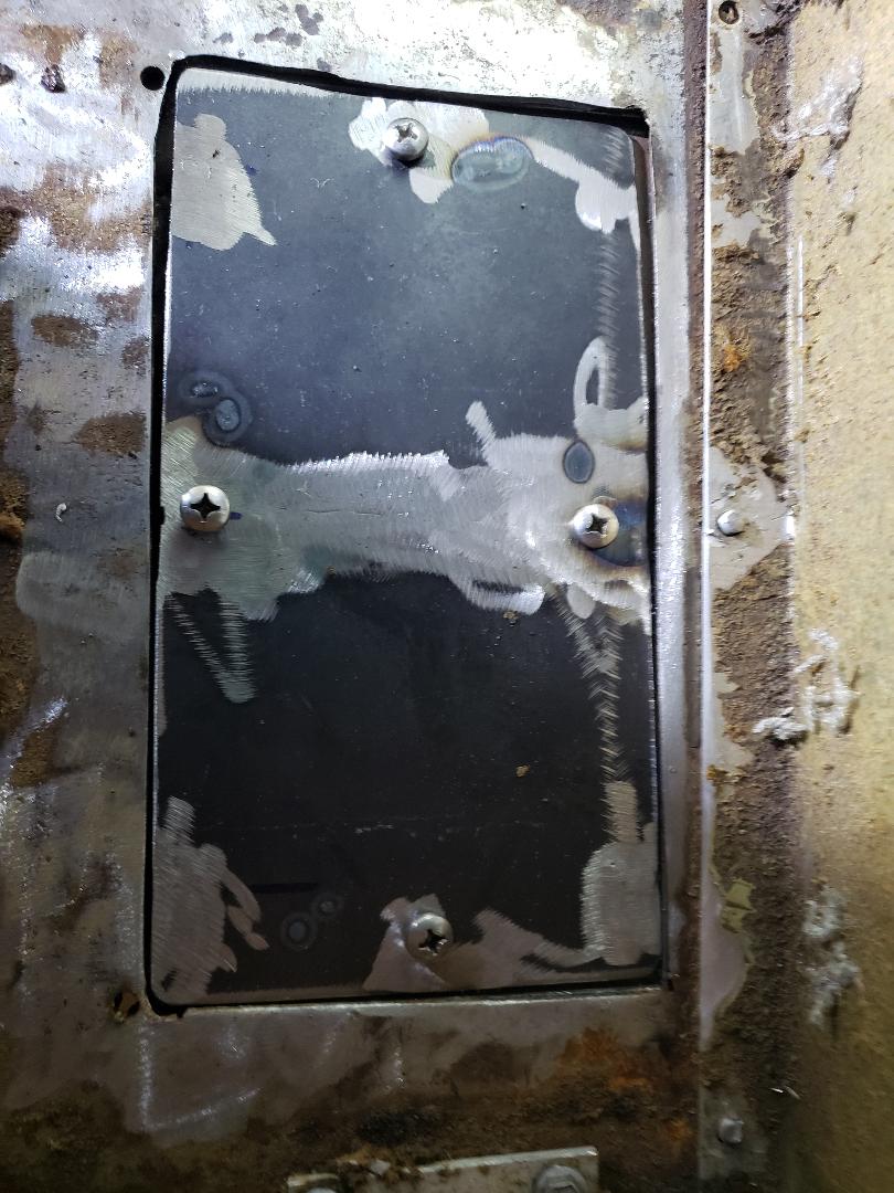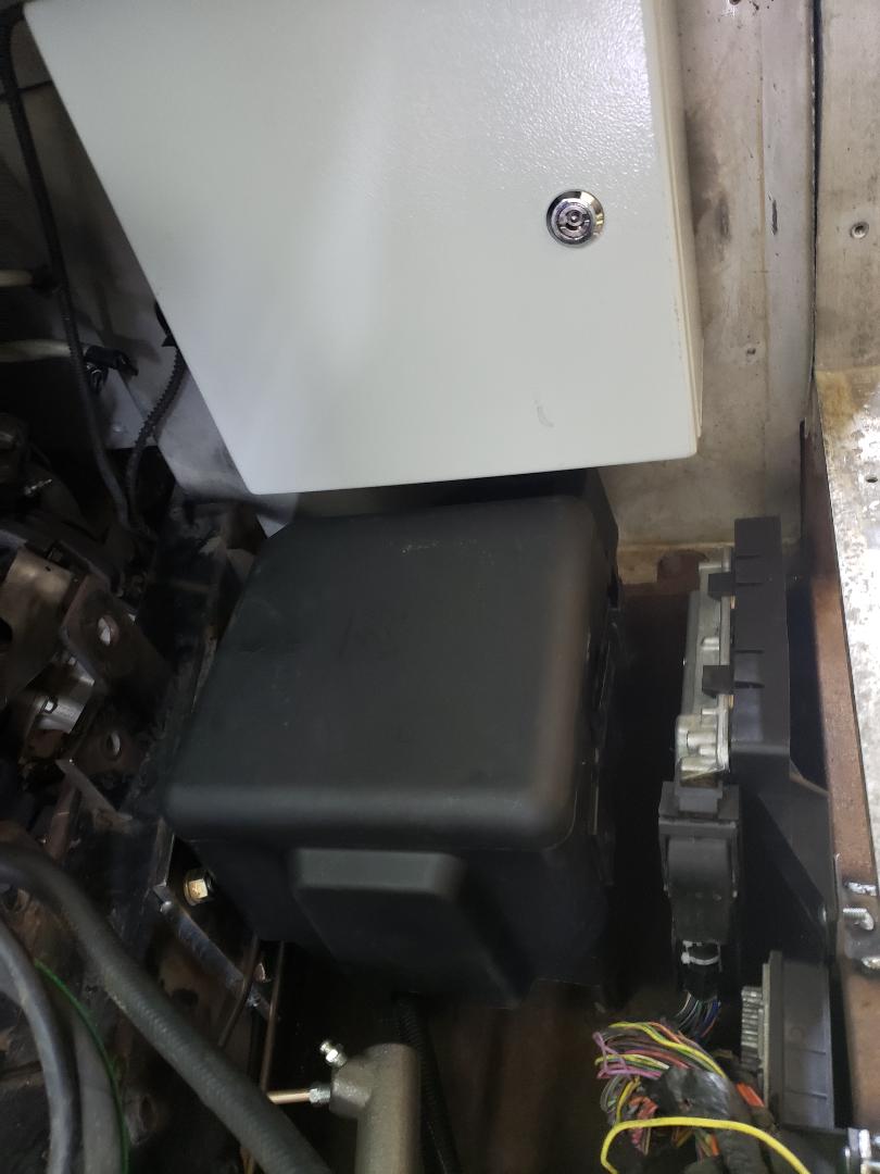 New junction box for LOTS of wires. | This is a shot of the steering box (one of the 21 or so HD boxes FMC used for some reason). I'm using two hydroboost units in place of the hydrovacs FMC used. The blue line is the case drain for the front hydroboost, the upper line is the new high pressure line from the front HB. | This is the radiator for the water to air intercooler. It will have fans to pull air through it and will be ducted down and out. | This is a new access door for the front HB. Too bad 669 didn't have one before. | ||