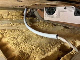 My trusty framing square was the only handy straight-edge so I used it to point the shortest pathway from the corner of the roof-vent opening across to the cavity above the wardrobe closet. I had a chunk of 3-wire kicking around so I used that and simply deleted the red wire. Note: I've already removed the entire house A/C system; including, both A/C units (lower late-model style), the control panel above the wardrobe, and all wiring EXCEPT - the two 120-volt AC feed wires that were/are still feeding from the engine house transfer switch and upper breaker box in the rear bedroom. There they are labeled AC #1 & AC #2. My roof air unit will live on AC#1 circuit while the AC#2 circuit will drop down (out of the junction box in the wardrobe) directly into the new storage compartment, that used to house the AC units, to feed an easily accessible GFI recepticle for running power tools, BBQ rotisserie's etc. | (1 Comments) If you use standard 14-2 wire (thinner) you may have an easier time of it. You can see where the wire exits the opening then goes up OVER the alum roof rafter, basically in a line towards where the vertical line of the open wardrobe door edge would meet the ceiling. I make no guarantee that this method won't damage any existing 12-volt wiring during this work. My ceiling light works still. I first piloted a hole with a coat hanger wire (straightened)jamming it back and forth towards the wardrobe. You'll be fighting through spray foam insulation. Once I had a hole I could pilot the wire through easily I cut the coat hanger wire at about 30" and used the 'curly' twisted end as the bit to 'drill' through the foam and widen the pathway. Make this tool - or something similar - then chuck it in your drill and spin the pecker while working it back and forth through the hole to widen it sufficiently to push a wire through it into the closet.NOTE: Ended up ripping this 3-wire chunk out and pulling some red 12/2 through instead. Thanks for the advice, Hal. | (Again: I ended up replacing the white 14/3 with red 12/2 lumex.)Here you can see where the wire came into the space. I left the coat hanger all the way into the hole then carefully ran a long utility knife blade (3 + inches) along the metal ceiling plate until I felt it hit the coat-hanger. This will be your 'Ah-ha' moment. You can also see the hunk of pex pipe I used as a conduit. When you remove the long vertical wood finish strip that runs up the corner from the metal junction box you might also find a bunch of sharp pointed metal staples sticking out into the cavity there where your two thick black wire looms ran up to the AC control panel above. The bunch of staples creeped me out so I opted to run the wire past them inside a piece of pex. | Here you can see how I utilized the OEM cable connectors: the top one is the new wire from the proposed roof AC unit above. The one below exits the AC #2 circuit down through into the outside compartment cavity. REMEMBER TO PULL BOTH A/C FUSE-PLUGS FROM THE BREAKER BOX IN THE REAR BEDROOM BEFORE DOING ANY ELECTRICAL WORK! | ||