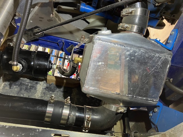 This is the coolant heat exchanger I chose for the intercooler. It features 8 AN fittings which are about the largest flow for this class of cooler. It's also compact enough that I could work it into the engine house door cooling-center. | The ABS fitting I chose for the reservoir made it easy to adapt down to a 1" braided hose off the top (4") to get me a simple filler hose over to the rad fill access. The screw in plug also helps with bleeding air out of the system. | Overhead view of the live-bait-well pump. I also tee-ed off the outlet hose with a drain-cock fitting to easily drain the (approx 2-qts) from the system if needed. | I cut up some 1/8" plate to mount the left side of the cooler on while the right side simply bolted into the main frame rail. It was solid then but I also elected to put a small (adjustable tension) pipe strap stay on the top as well. | ||
