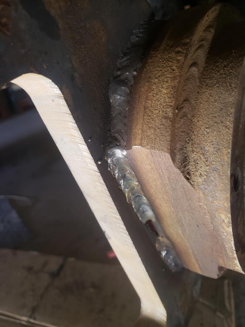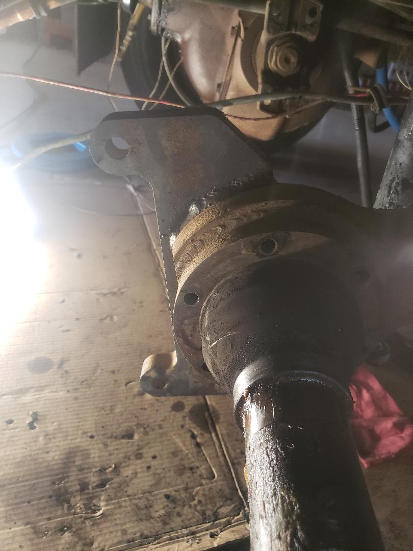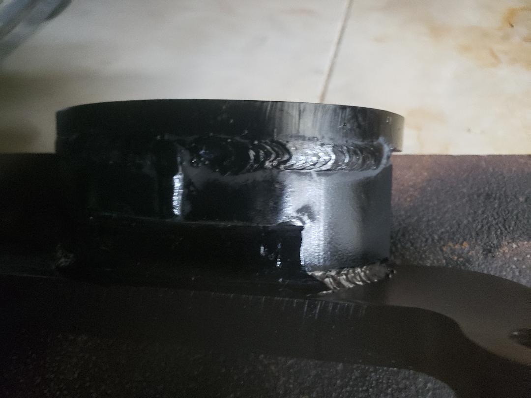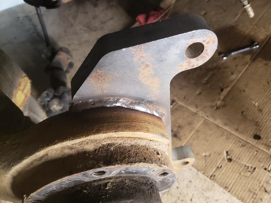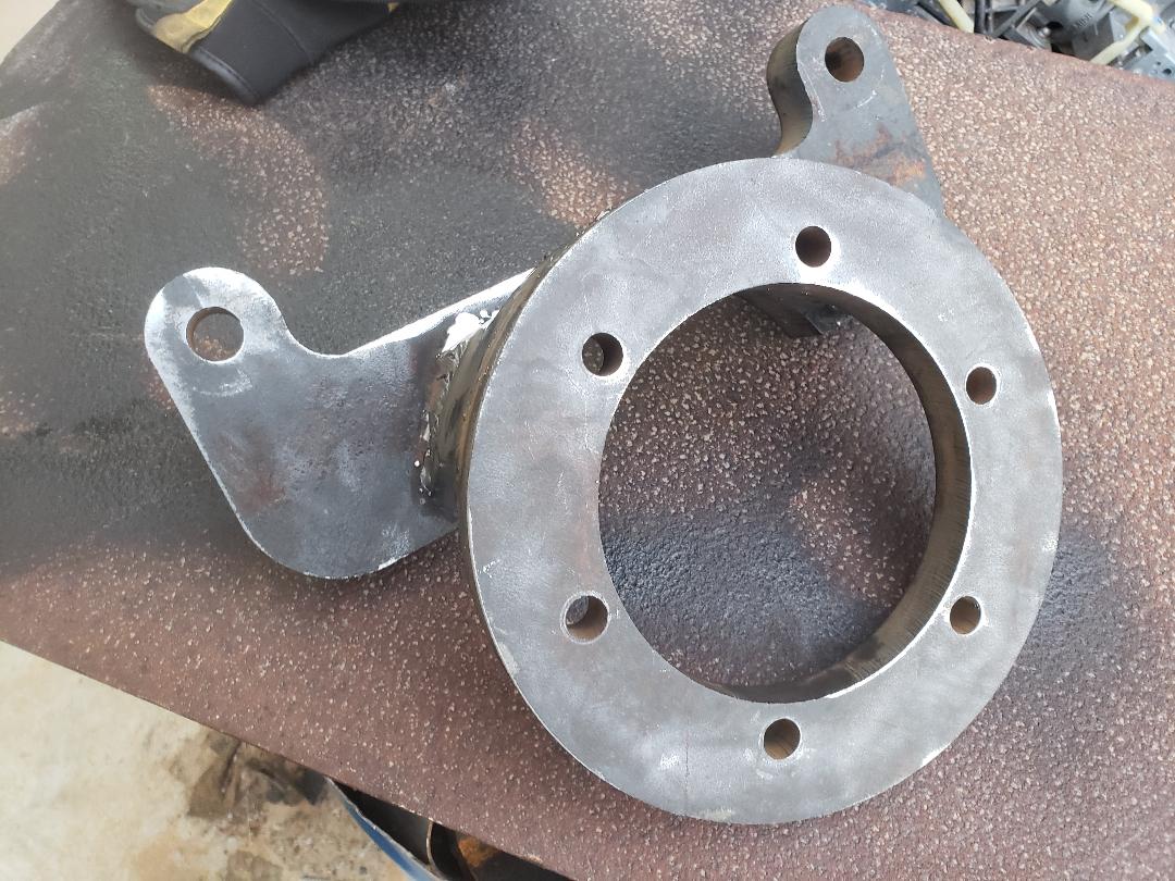 Drivers side rear caliper bracket | Still need to find some brake hose that will work. | The later control arms are relieved for disc brake callipers. Makes things abit easier. | Front bracket welded up and ready to squirt and mount. The round flange is 3/4", the two hole bracket is 1". Plenty stout | ||