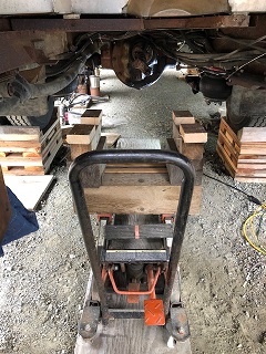 (1 Comments) Took measurements from underneath using the forward end of the fiberglass trans tunnel (end of tape butted against it) to figure where to cut the floor. If you do this, use a skilsaw with the blade depth at about 5/8" as the sheetmetal is directly beneath it. | My friend and project supervisor, Liam. He's a Cummins-nut same as me and is also shop-foreman at a large Chrysler dealership in town. Helps keep me and my 'ideas' grounded in the real world. | This lift was invaluable to enable me to do this on my own. I'm on roadbase/gravel so an 8ft strip of 3/4" plywood made the perfect runway under the coach to get it out then back in again. | |||