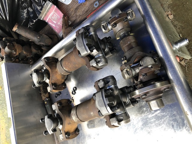 Oil seals: 2 x #A1205L766 1 x #A1205K635 Pinion & Output yoke nuts: 1 x Pinion nut - #1227C939 2 x Prop shaft nut - #1227Z936 | 6-new U-joints from MP Parts in SC. | In the end, I had to make a couple of additional notches over the two nuts closest to the bedbase wall. Drilled a jigsaw pilot-hole from above where I anticipated each of the nuts were, then with a metal blade jigsaw, cut out all four corners.(Note: there's hoses and shit under the floor so be certain of blade clearances BEFORE you cut) This will be a real easy floor fix when I'm done, and the procedure saved me huge time and effort. | |||