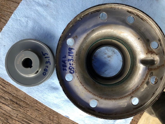 New seals and yoke nuts done, now torque the yoke-nuts back and get this sucker back home where she belongs. Note on the pinion nut torque: After a lengthy discussion with Gord, at WestCoast Gear in Vancouver BC., I took his advise and nearly halved the previous torque spec (from 600 ft/lbs down to 350 ft/lbs) on the pinion yoke nut. He's rebuilt hundreds of gear cases for all kinds of heavy equipment and he was positive that 600 ft/lbs was far more than necessary. Again, this only his opinion and I happen to agree. What you chose to do is your business. | Took a bit of looking but I found a cheap pulley wheel for an electric motor etc. that fit perfect to gently drift/tap the new oil seal into place. Be careful not to let it get tilted out of whack. | Once you pull the pinion assembly out (carefully so as not to damage or mix up the shims) you'll need to separate the front flange to get at the pinion oil seal. Do this by threading 3 bolts into the holes provided and turn them in slowly equal in turns as best you can to part the flange. When you're done, clean the parts of old gasket/seal material and use a good quality RTV sealant to make a new gasket as they are no longer available. I found a cheap pulley wheel to use as a punch to drift the new seal into place. Worked perfectly. | |||