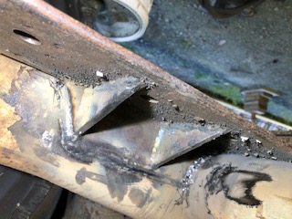 The bolt holes are more or less in a straight line on 4 1/4" centers. My laser came in handy for aligning the holes (which are also the centerline of the air-springs and the 3ft long mounting arms) which all had to position correctly (plumb) beneath the upper spring mount on the chassis. As is shown in the pics following, the 6" dia. circular 1/4" upper spring mount disc needs to be offset from the chassis beam enough to allow access to the mounting bolts and air-line hardware. | Here you can see the weld on the radius of the outer torsion bar tube. Had to grind off a bunch of what appeared to be asphalt black undercoating to expose clean steel. | Ignore the extra hole in this view; it was already in the beam material I used. | |||