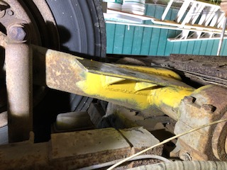 To figure what I thought could be right place to weld the upper spring mount I decided to use the point on the chassis frame where the radius from the center of the torsion bar tube (center of rotation) out to the center of the air spring disk. Then it was a simple matter to transfer that distance up onto the chassis. | Forgive me my Cummin's brethren for I have sinned...all I had handy was some 'Caterpillar yellow' rust paint! | ||||
