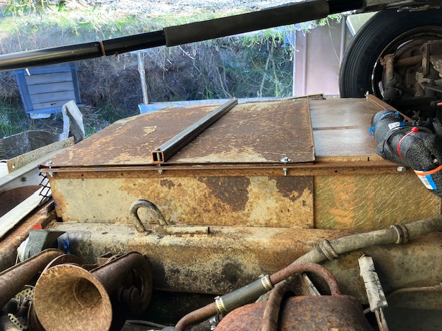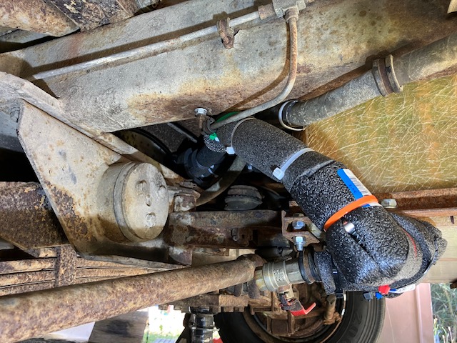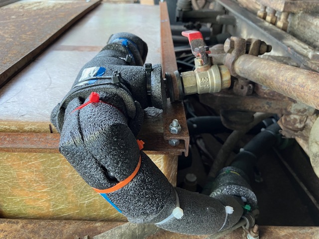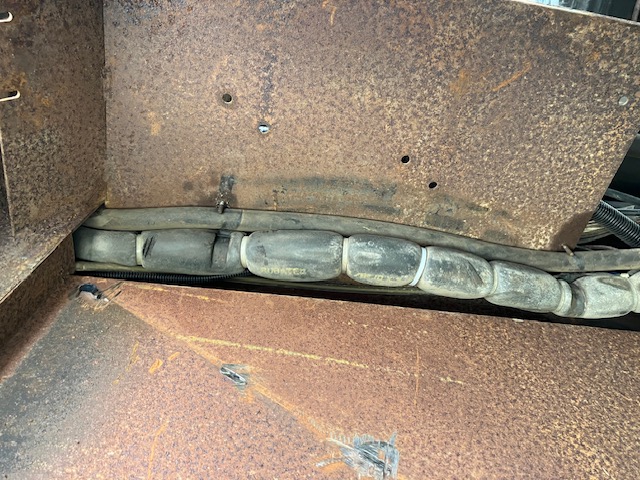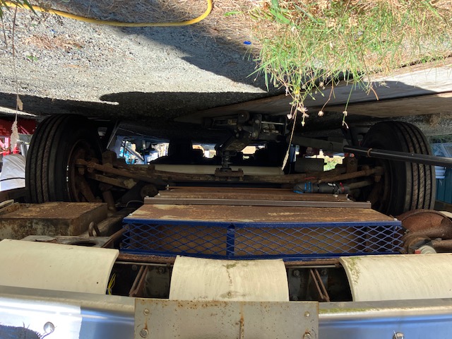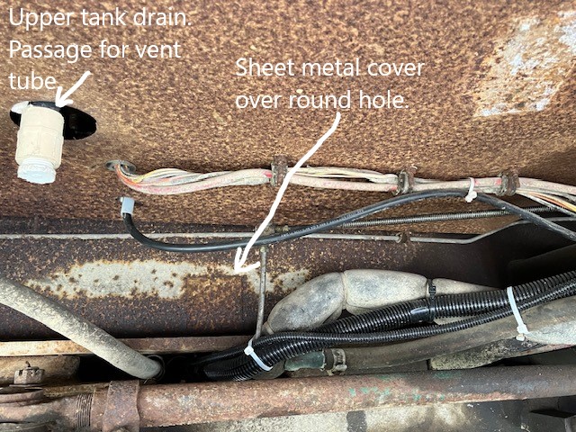 As part of the clearing out of the old A/C components from the cavity where the new tank will go, you also need to make a passage for the new water lines to get to the tank. I found this conspicuous looking sheet metal plate tacked on the main cross-member and discovered that sure enough - this is the passage that was used on the early coaches to get water to & from the lower forward tank. It's a bitch to reach and get opened up so jack the coach high to make it some easier. | You'll have some cutting and grinding to do to get this prepped for the tank. | Be certain to get all hoses & wiring up and out of the way of both the tank and the steering rack! | Install done. The last part went better than the beginning. With the exception of not being able to use the fiberglass housing top-cover (because I made the tank 1/2" too tall) it all went the way I wanted. The tank is still insulated on top regardless. Here you can see the pathway to the round hole in the cross member for the water lines and the drain ball-valve etc. The bottom sheet metal original cover served well to hold the tank up. I added a 1"x1" cross bar as well for extra support. | ||