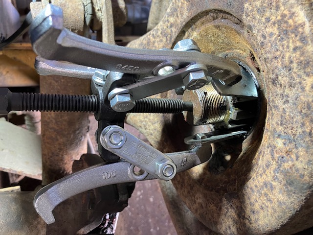 ...now to pull the seal. Scrape some of the crud from the perimeter. I then sprayed some penitrant on it to help it ease out. Prolly didn't need it. NOTE THE SEATED DEPTH OF THE SEAL BEFORE YOU TAKE IT OUT! | After seeing how little space there was between the shaft and the seal I realized the 3-jaw puller I'd bought was probably too 'clubby' to get in there and again wished I had a 2-jaw one like Dan used. So I decided to make up little clip/hook jobbies to get in there and then hook the jaws into them and pull it out. What a calamity that idea created. Needed three extra arms to hold shit in place with all the 'hookin & screwing' going on... | ...now to get the 3-jaws hooked in while keeping all three of these pricks hooked into the seal... | ...finally got'er and little by little... | ||