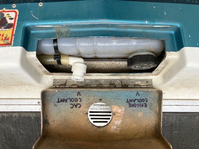 The ABS fitting I chose for the reservoir made it easy to adapt down to a 1" braided hose off the top (4") to get me a simple filler hose over to the rad fill access. The screw in plug also helps with bleeding air out of the system. | This is the coolant heat exchanger I chose for the intercooler. It features 8 AN fittings which are about the largest flow for this class of cooler. It's also compact enough that I could work it into the engine house door cooling-center. | Behind the new intercooler rad you can see I kept the awesome trans cooler from the 440' install that a PO (trucker) had installed. I've also added another smaller trans-cooler on the main radiator to further keep the 47RH cool. | |||