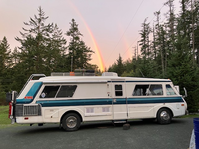 FINALLY! The old Ford Taurus fan steps back into service. It's pulling cool air through into the engine house at around 5000 CFM. I'm confident #846 will be a robust and cool-running 'Desert Rat' when I'm done with her. | After sitting for a year she's good-to-go to the lake for a few days. I think the 'Double-Rainbow' is a good sign that all will be well. | Roof rack turned out to be a godsend. Tons of room for extra firewood etc. She sits a tad higher in the rear if you noticed, and that's with only 20 psi in the airsprings. | First night... serenity. | ||