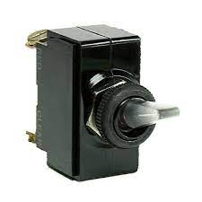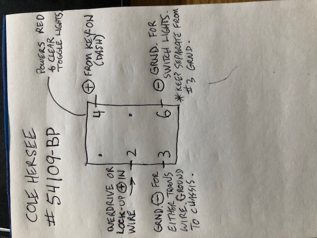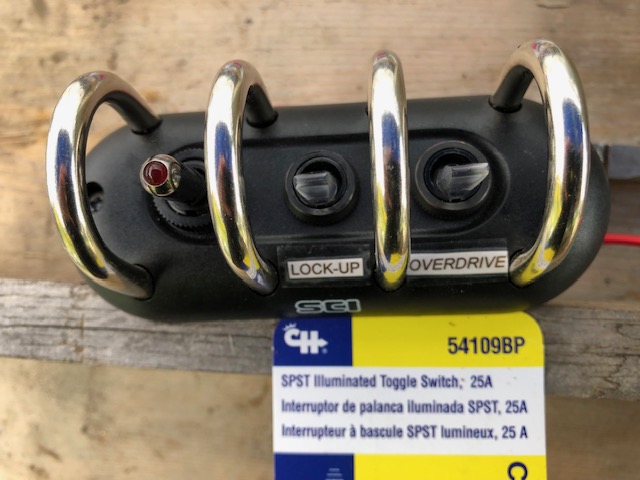 MANUAL CONVERTER LOCK-UP AND OVERDRIVE SOLENOID SWITCH OPERATION:84'-85'CHRYSLER 47RH TRANSMISSION After much consultation with transmission builders I've installed these switches to lock and unlock the torque converter (only in 3rd & 4th gears) and shift in or out of 4th gear(overdrive). NOTE: YOU MUST BE CERTAIN THE CONVERTER SWITCH IS 'OFF'(UNLOCKED) BEFORE SHIFTING IN OR OUT OF 4th. GEAR. SO: IF YOU ARE 'LOCKED'(RED LIGHT) IN 3rd. AND WANT TO UPSHIFT TO 4th. - UNLOCK/UP-SHIFT/LOCK. SAME FOR DOWNSHIFTING OUT OF OVERDRIVE (4th) - UNLOCK/DOWN-SHIFT/LOCK. CAUTION: UNLOCK CONVERTER BEFORE COMING TO A STOP OR ENGINE WILL STALL. THIS TRANSMISSION UP/DOWN SHIFTS 1st.THROUGH 3rd. GEARS SAME AS THE 727 TRANSMISSION. ALSO: THE 47RH ONLY HAS LOCK-UP CONVERTER CAPACITY IN 3rd. & 4th. GEARS. WHEN USING THE PAC-BRAKE EXHAUST BRAKE THE CONVERTER MUST BE LOCKED TO BE EFFECTIVE. | This 3-gang switch holder had the other 3-pole switches in it (see the one on the left) that didn't work for me. Got the assembly for just over $10/bucks at our local Princess Auto (Canada's 'Harbour Freight') I liked the chromed switch guards that prevent accidental contact with the switches. With only slight modification (grinding with a Dremel stone) the Cole Hersee's switches dropped right into it. I chose the location as it's only a few inches off my right knee. After putting a few miles on the coach I have to say I'm extremely happy with my choice to run with these switches to control the 47RH. The Lucite switches are lit-up white when off and red when on and are prominent in your peripheral vision while driving. Will comment more on this later after I put some more miles on her. | This switch can have up to 6 terminals. This one has 4. This schematic gave me full independent control over both solenoids with lighted switches whether they're off or on. I did bridge both #4's to a key-on positive and did the same with the #3's to ground both trans wires. | Toggle switch I chose for the overdrive & converter lockup solenoid cockpit controls. Cole Hersee toggle switch #54109-BP. Dual colour toggle. 4 - terminals. | ||