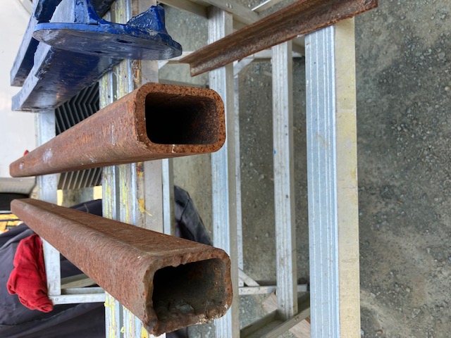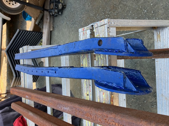 Ready for paint. | Pieces cut up and ready to weld. | UPDATE: Been remiss to post this so I'm playin' catch-up here. My choice to use some U-channel material I had kicking around to then weld into a box-channel for the trailing arm air-spring mounts, came back to bite me in short order. You can see in this pic how much the deflection load bent the one on the left. Fortunately, I designed the upper forward mount for these arms to easily be bolted/unbolted to for servicing. So a year or two ago now I finally decided to use the heavier (much heavier) box channel on the left to get busy and build new ones. It required drilling through oversized bolt access holes to get at the bag-mount nuts. | |||