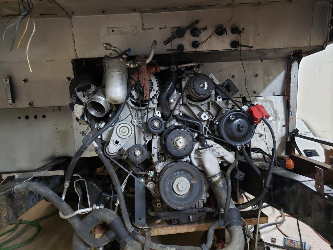 From above. | Had to cut out more than I figured. | Need to get rid of some of the excess parts and pieces but looks like there is room everywhere with the additional 1.75" forward movement of the package. | Drivers side motor mount | ||