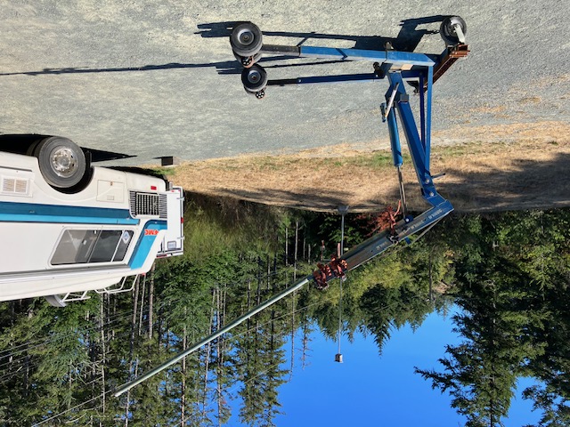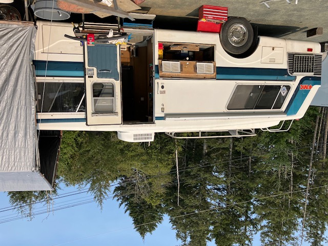 All done. I RECOMMEND LEAVING BOTH CIRCUIT FUSES OUT OF THE BREAKER BOX IN THE BEDROOM UNTIL YOU ARE READY TO FINISH THE JOB. Good luck! Terry #846 | So, time to figure how to get the 'wart' up onto the roof without help. The light went 'on' and I came up with this. Had a handy 12ft hunk of heavy walled 2 1/4" alum pipe kicking around. Dam AT-engine crane sure proved its worth. | Worked like a hot-dam. | Yeah... not quite as pretty as the newer low-profile jobbies, but these guys are proven work-horses and I picked up another that also blows real cold for spare parts. BONUS: tested while plugged in to shore power, running off the genny, AND it runs great off the Cummins alternator at idle! My alternator is a stock Denso (approx 225 amps) with an external regulator mod to a 1-wire unit. Ready for the desert! | ||