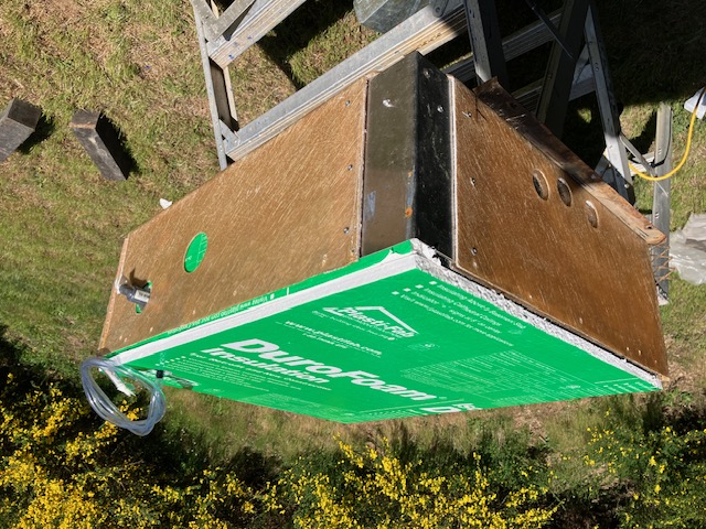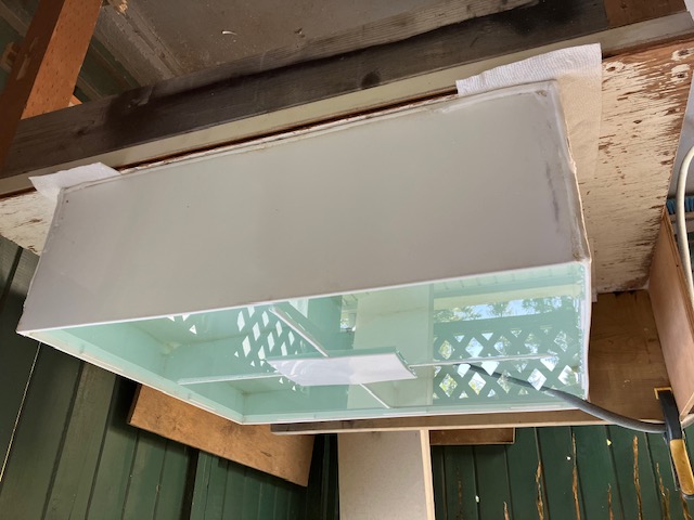 On the early coaches you got a 38 US gal forward tank beneath and forward of the front spring. This is the fiberglass housing that encased the tank and insulation around it. If you can get one of these somewhere it'll make your job easier... sort of. I ended up making my own tank and elected to make it 1/2" or so taller which necessitated getting rid of the upper lid which then didn't fit. | Here's one of the early forwards tanks I got from buddy, Jay, in Wa. along with the housing a few yrs back. Fittings on this one leaked badly and regardless of my best efforts to weld them up to stop the leaks I was unsuccessful and had to toss it. I would learn later that 50-ish year old HDPE simply isn't worth the time or trouble to repair and expect any useful service out of it. I'm posting some dimensions here as well for future reference. | I decided to learn to do plastic hot-air welding to build my own tank. If anyone decides to follow along and make their own tank - THEY DO SO ENTIRELY AT THEIR OWN RISK. This post in no way is intended as an instruction publication on how it should be done. It's merely my account of how I did it and the issues I encountered. | Got me a hot-air welder, a 4x8' sheet of 1/4" HDPE, a bunch of 3/16" x 3ft. wht. HDPE welding rods,bucked out all the pieces on my table saw and with the scraps I welded up this contraption to see if my very first corner-weld would hold water. Well, it did... for 3 days till I dumped it out, then satisfied my plastic welding apprenticeship was successful. What a pile of shit that notion turned out to be. | ||